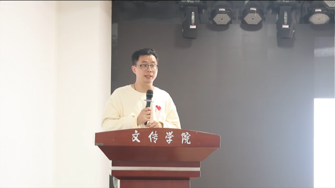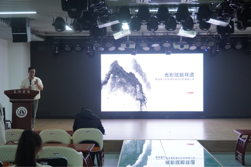 讲座中,徐剑从“什么是非遗”、“黄山市非遗现状”、“非遗影像的创作方向”等三个方面进行讲述。以《千年徽州 百年徽学》为先导片,讲述国际与国内对非物质文化遗产的具体分类。以《傩舞故里》《星空下的古徽州》等短视频为案例,讲述黄山非遗保护与创新。以《竹雕刻风骨》廉洁文化公益短视频微案例讲述如何打破传统的叙事方式,采用新颖的叙事角度和手法,让非遗故事更加生动有趣。以微纪录片《瞻鱼》为案例讲述纪录片如何从“镜头”到“共鸣”的探索。