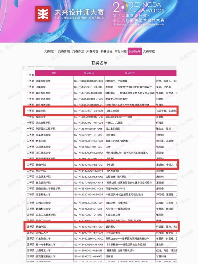 8月26日下午,第13届未来设计师·全国高校数字艺术设计大赛(NCDA)国赛评选结果正式公布,太阳成集团tyc9728师生表现优异,共获国家级一等奖1项、二等奖1项、三等奖1项。