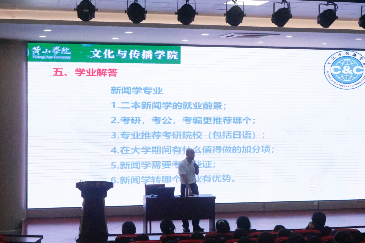 吕院长结合文传院新闻学、戏剧影视文学、广播电视编导等专业特点,深入解答了新生们关切的学业问题。针对新闻学专业,他从二本院校就业前景、考研考公考编选择、推荐院校、大学加分项、考证建议及专业转型优势等方面逐一剖析;对戏剧影视文学和广播电视编导专业,也围绕书单影单、课程设置、发展路径、实习实践等维度进行了细致指导,让新生们对专业学习与未来发展有了更清晰的认知。授课中,吕正兵提出的“博学、笃行、明辨”期望引发了新生广泛共鸣。