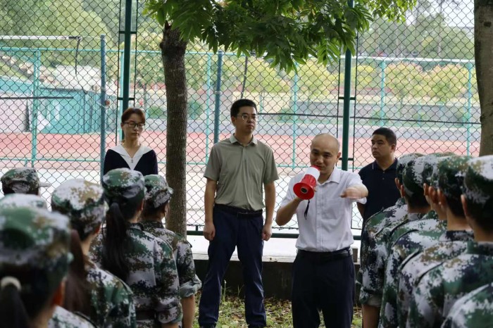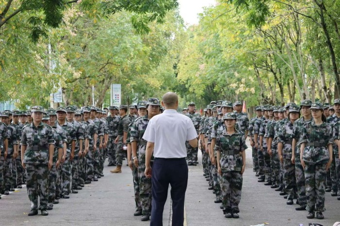 校园林荫道上,新生们身着迷彩服,身姿挺拔,精神抖擞,正以饱满的状态与积极的态度投入军训当中,学院领导详细询问了新生的训练与生活状态,对他们在军训中表现出的坚韧意志和优良风貌给予充分肯定与表扬。