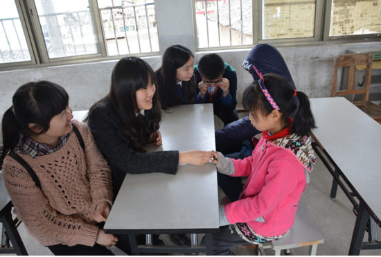 看到支教“老师”的到来,小朋友们从窗户中探出一个个小脑袋,显得异常兴奋。支教志愿者们和孩子们聊天、游戏并手把手地教小学们使用照相机和摄像机;摄影组的同学用手中的摄像机记录孩子们一天的上学的过程,随后文传学院的志愿者们将把这些纪录片剪辑后通过微博、微信等形式发给孩子远在外地务工的父母亲。
