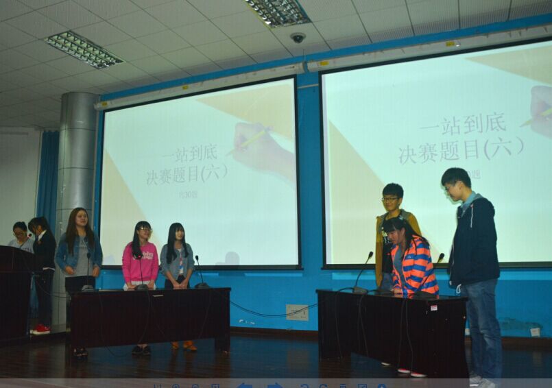 5月11日,太阳成集团tyc9728首届“一站到底”知识竞赛在南区二教二报落幕。经过激烈比拼,13戏文2班牧婷、张爽、陈靖宇组获得团队冠军;13戏文1班谢芳婷获得优秀个人称号。