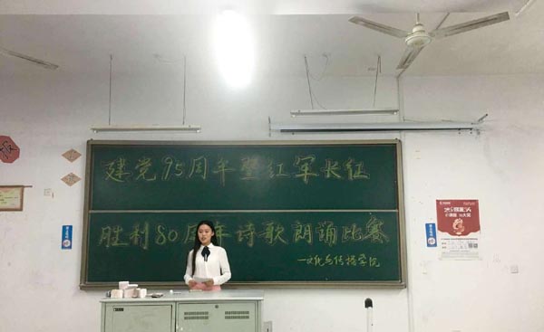 “诗以言志,歌以壮行”,10月12日晚7点,文传学院“建党95周年暨长征胜利80周年”诗歌朗诵比赛在2310教室举行。经过激烈角逐,汪佳芬的《青春中国》获得一等奖;谢晨宇的《军礼》、房丽《党的赞歌》获得二等奖;路彪、于惠、张成杰等三组选手获得三等奖。