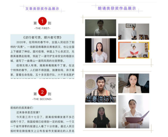 5月9日,“绽放战疫青春,坚定制度自信”线上防疫比赛圆满落幕,此次比赛以朗诵作品、文学作品征集的形式开展。我院青年学子纷纷发挥专业优势,从疫情防控中的大小感人故事来感悟五四精神的内涵与外延。