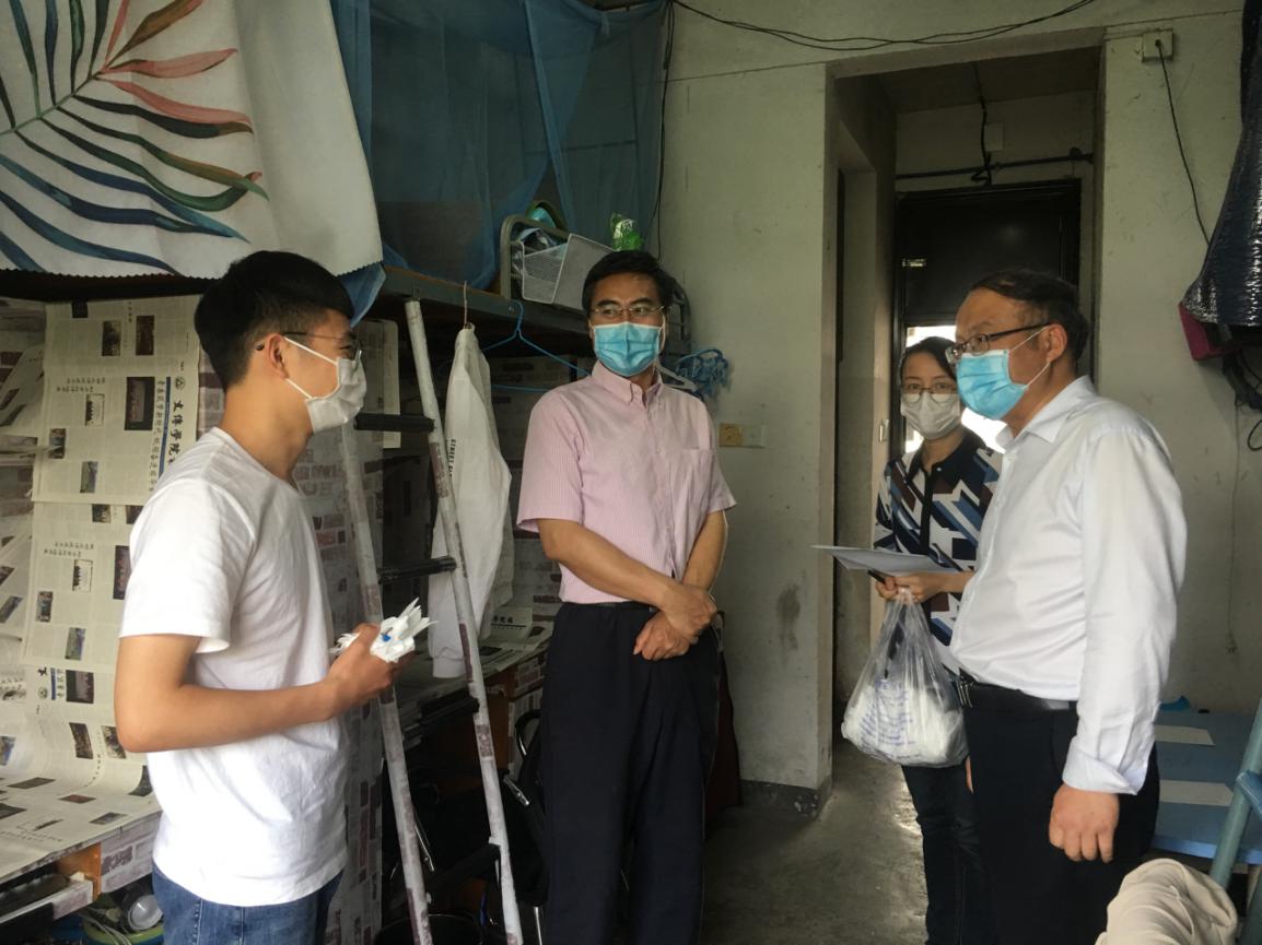 5月12日下午,院党委书记汪家庚、副院长王俊峰、党委副书记郑静及辅导员余瑶走访了学生宿舍,看望我院第一批返校毕业班学生,并向学生发放防控物资。