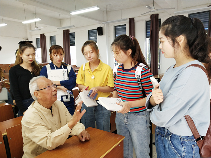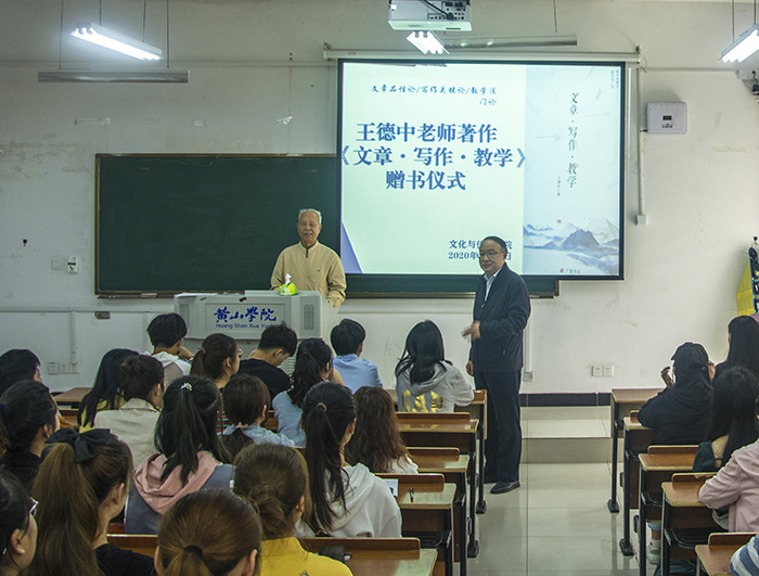赠书仪式上,王德中与同学们讲述了曾经在屯溪高中(现屯溪一中)和徽州师专(现9728太阳集团)教学岗位的从教经历,表达了自己赠书的目的意义。王德中说:“你们学的是新闻专业,将来免不了要写新闻作品。新闻文体无论是消息、通讯、调查报告亦或是报告文学都属于文章的范畴,这次赠送的书与同学们的专业学习有关,与学生的成长成才有关。”王德中分别从文章品性论、写作关键论、教学法门论等三个方面向学生们介绍了自己的著作。文章品性论,阐述了文章的五种属性,文章是实在信息的集合、文章是主体心理的外化、文章是一个对策系统,这从根本上揭示了文章不同于文学的本质属性;文章的作者、文章的编者、文章的文风和文章的功能等篇章都从全新的角度铨释了文章的应有素质。写作关键论,重点解剖了文章写作的心理现象,揭示了文章写作心理与文学创作心理的根本区别。教学法门论,讲述文章写作教学乃至语文教学方面的经验及研究成果。王德中寄语同学们珍惜韶华,永葆芳华,始终以自律的人格、旺盛的精力、坚定的意志进行创造性劳动,毕生为国家、为人民奉献自己的心血。