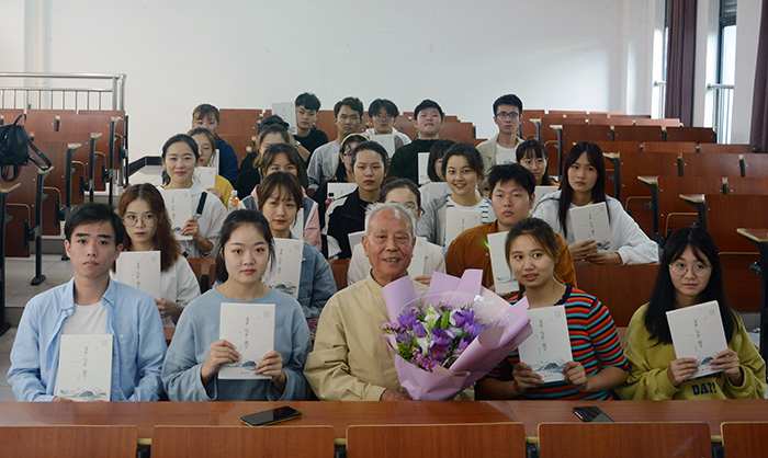 汪家庚感谢王德中老师向18新闻全班同学捐赠个人专著。他向同学们介绍了王德中老师教书育人、潜心著书立说、笔耕不辍的事迹和成果。王德中现年83岁,笔名东方山泉等,字华三溪,出生于兰溪,成长于绩溪,执教于屯溪。先后发表学术论文150多篇。此前曾出版长篇小说《金湖之畔》和专著《生活感知录•时序卷》,并有近千篇博文上传网络。一生与溪有缘,他的品性文章与唐代诗人元结的山水小品《石溪记》中“清流触石,洄悬激注”之状神似;有道是“上善若水”,水为至善至柔,微则无声,巨则汹涌;水与人无争且又容纳万物,水自有滋养万物之品德,可谓德在其中。学生代表向王德中老师敬献鲜花,场下的学生掌声雷动。