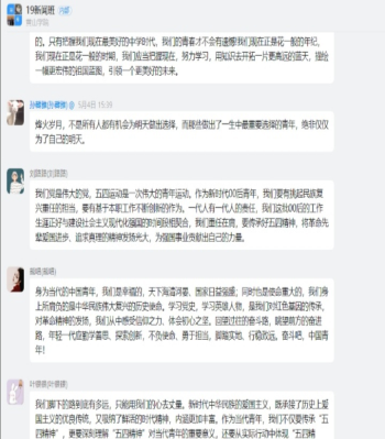 团课结束后,支部运用QQ、微信群、钉钉等形式开展线上讨论。针对此次的五四云团课,同学们积极分享自己的感悟心得,纷纷表达了要继承和发扬五四精神、担负起历史重任的决心。