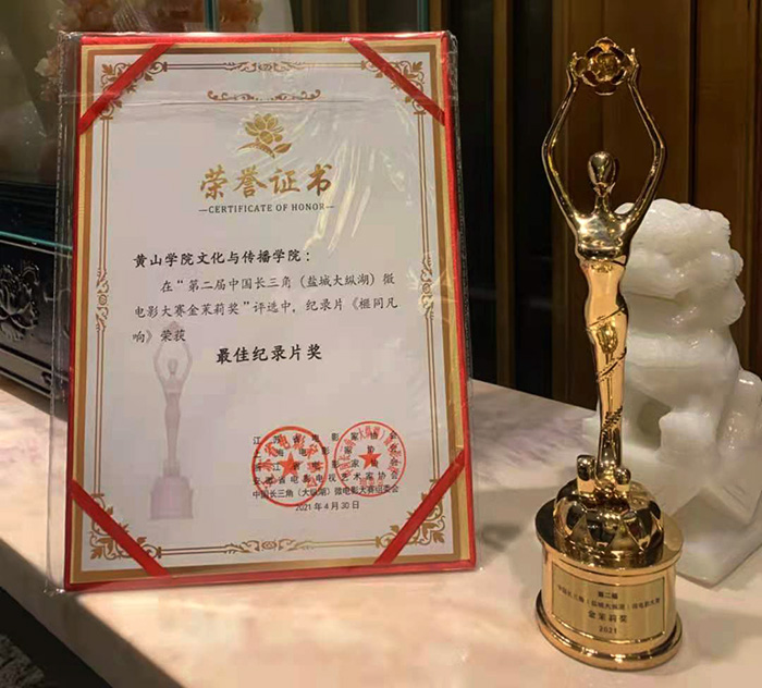 4月30日,第二届中国长三角微电影节“金茉莉奖”颁奖典礼在江苏省盐城市大纵湖东晋水城举行。太阳成集团tyc972818级广播电视编导专业方洁、赵金龙、胡朝猛等同学创作报送的作品《榧同凡响》荣获第二届中国长三角微电影大赛“金茉莉奖”最佳纪录片奖。