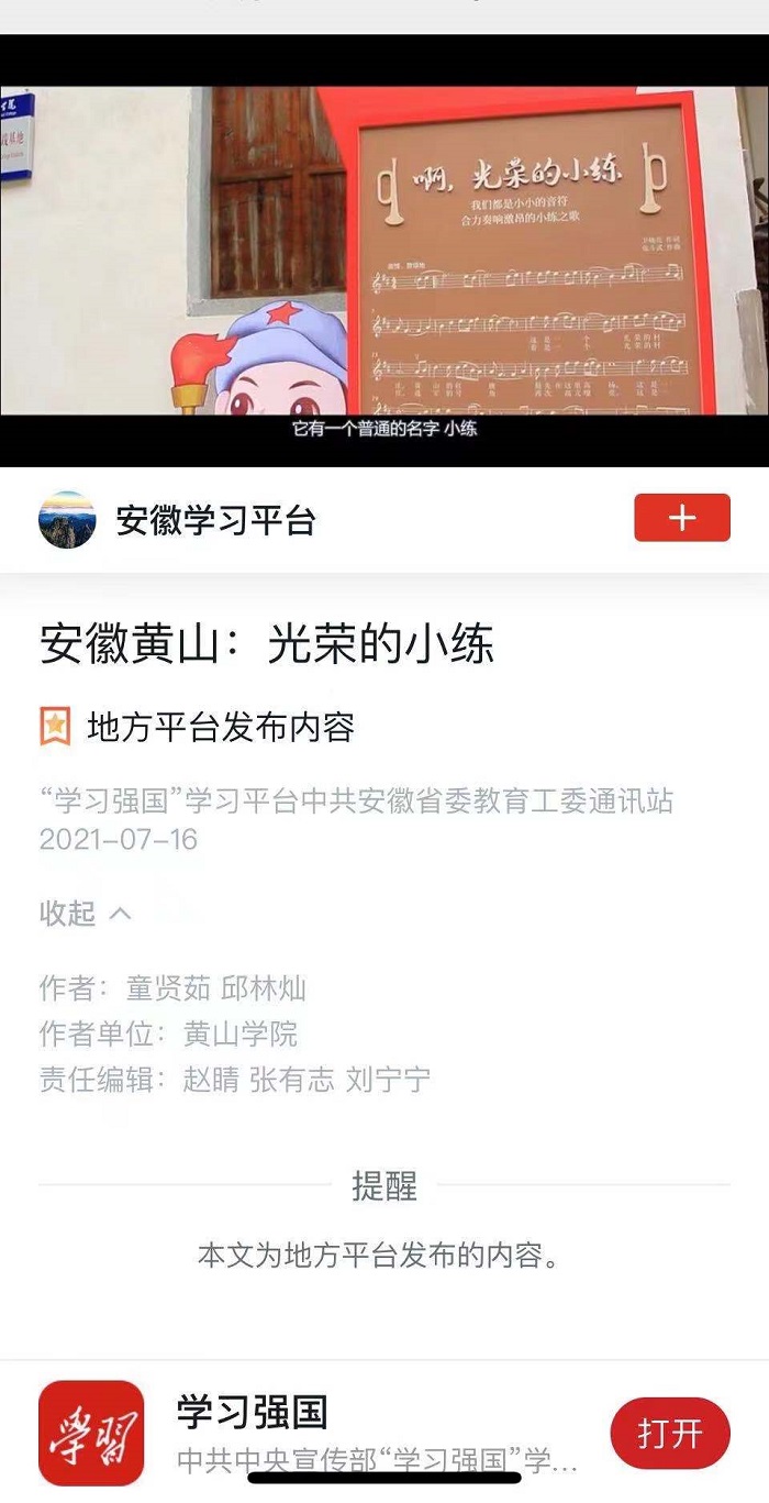 《光荣的小练》是我校首次荣登学习强国平台的短视频作品,它既是我院培养应用型人才的成功范例,也是我院党史学习教育“五个一”实践工程的优秀成果。