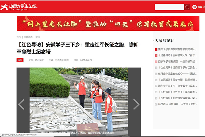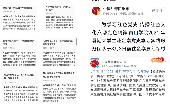 实践队员充分利用暑期时间开展形式多样的党史学习宣传活动,集体实践活动结束后,队员积极发挥专业优势以及新媒体传播优势,将多日来的所见所感、所思所想进行总结归纳,随后撰写稿件投稿至多方媒体平台,先后在中青校园、中国大学生在线、中国共青团杂志等多家媒体发稿26篇,获得良好的传播效果。