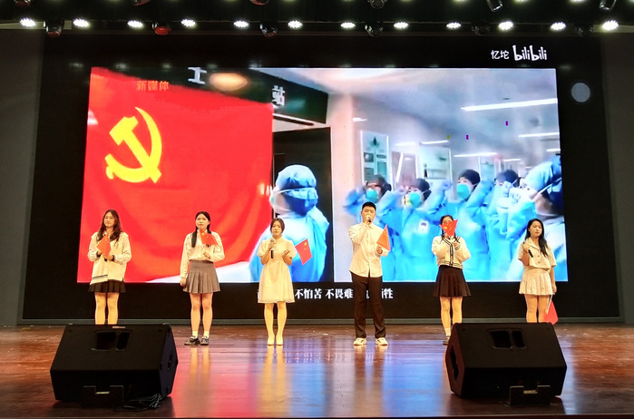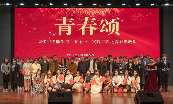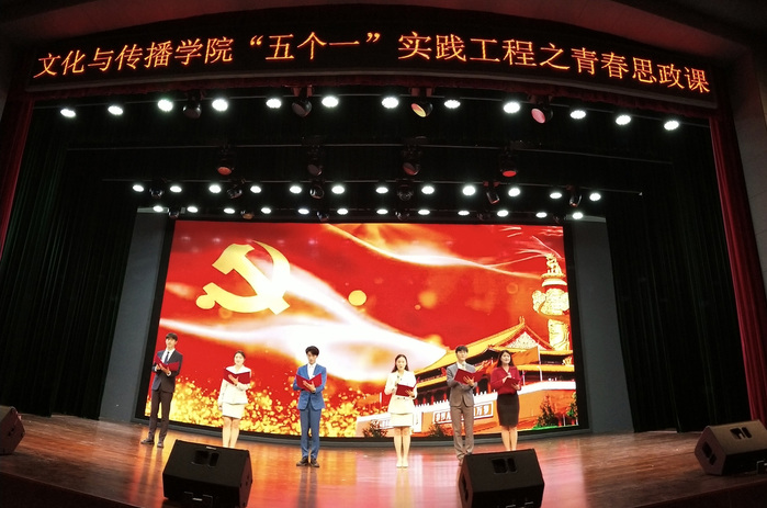 本次青春思政课活动主题为“青春颂”,以经典红色作品朗诵为主,由播音与主持艺术专业教研室承办。表演人员均为20级、21级、22级播音与主持艺术专业学生。整场活动以朗诵、情景表演颂为主,兼顾舞蹈、演唱等形式,多角度、全方位展现了文传学子优秀专业能力和良好的精神面貌。