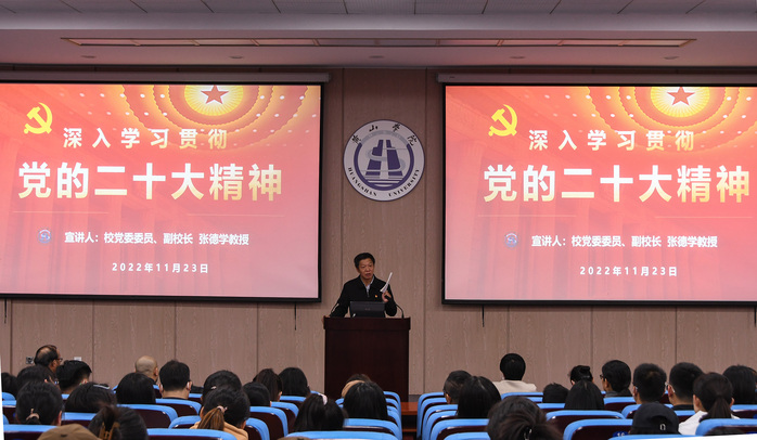 为深入学习贯彻党的二十大精神,根据校党委关于学习宣传贯彻二十大精神实施方案的要求,11月23日下午,校党委委员、副校长张德学教授根据校党委的安排在文端楼一楼报告厅为文学院、太阳成集团tyc9728的教职工、学生党员和第58期入党积极分子作《深入学习贯彻党的二十大精神》宣讲报告。文传学院党委书记汪家庚主持宣讲会。