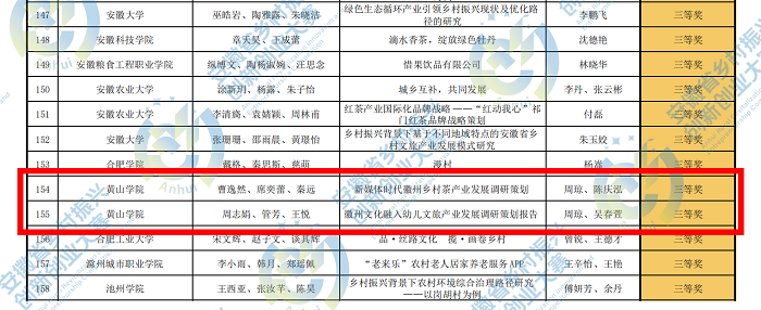 近日,2022年首届安徽省乡村振兴创新创业大赛获奖名单公布。我院20级新闻学专业曹逸然、周志娟等同学创作的2件乡村调研策划作品获得三等奖,我校也获得本次赛事的“优秀组织奖”。