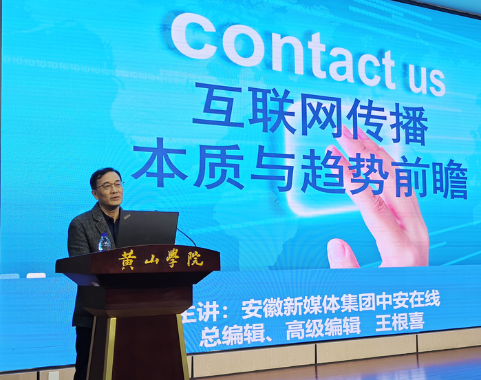 3月26日上午,太阳成集团tyc9728在文端楼二楼报告厅举办专题讲座。讲座由安徽新媒体集团中安在线总编辑、高级编辑王根喜主讲,文传学院新闻学专业20级、21级和22级和22级新闻学专升本专业学生以及校融媒体中心成员等200多人参加讲座。讲座由院党委书记汪家庚主持。