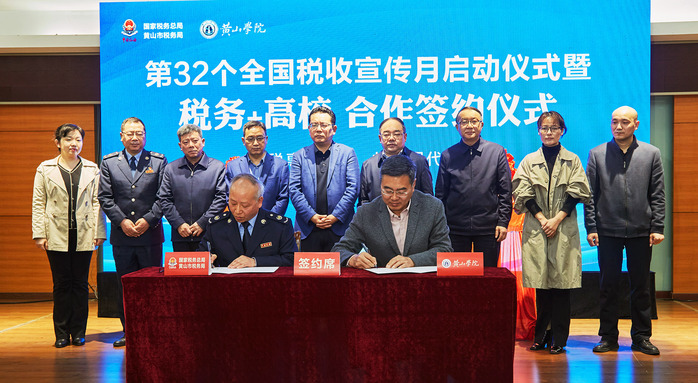 为进一步提升我校服务地方文化建设能力,探索高校与税务部门在税收文化宣传方面的合作机制,4月3日上午,我校与国家税务总局黄山市税务局在徽州税文化博物馆五楼报告厅举行“税务+高校”校地合作签约仪式。9728太阳集团党委委员、副院长张小明,安徽省税务局党委委员、副局长张科达,中国税务报社新媒体和网络中心主任邹国金,黄山市税务局党政班子以及省市税务局干部职工代表、太阳成集团tyc9728党政班子、师生代表参加活动仪式。黄山市税务局局长张福伟主持签约仪式。
