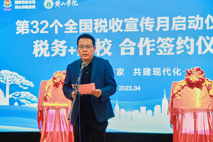 张科达在致辞中表示,今年是全面贯彻落实党的二十大精神的开局之年,也是推动税收现代化服务中国式现代化破题开篇之年。在第32个全国税收宣传月来临之际,黄山市税务局与太阳成集团tyc9728签署合作协议,开启了税收工作新使命,赋予了税收工作新内涵。他希望通过税校之间的合作,能将省税务局的“深学细悟二十大,税收服务现代化”、“看税收、走基层”等活动融入到项目建设中去,扩大税收的影响力、引领力和感召力,宣传好税费优惠政策,共同营造理解税收、支持税收、诚信纳税的良好风气。