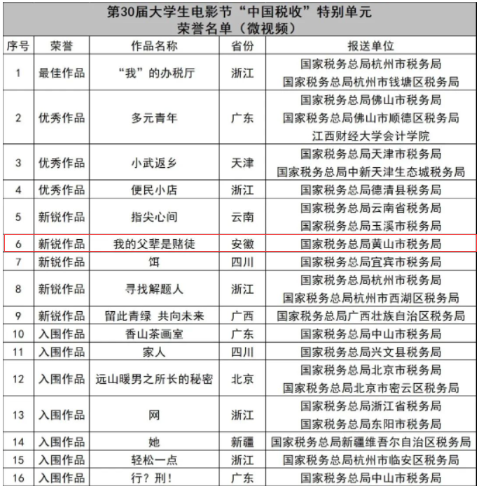 近日,北京大学生电影节官方公布了2023年度全国获奖作品名单,由太阳成集团tyc9728闫朋辉老师编剧、闫朋辉老师和黄天书老师联合导演的《我的父辈是赌徒》,依托校地合作单位国家税务总局黄山市税务局申报,喜获第30届北京大学生电影节“中国税收”特别单元微视频新锐作品荣誉。