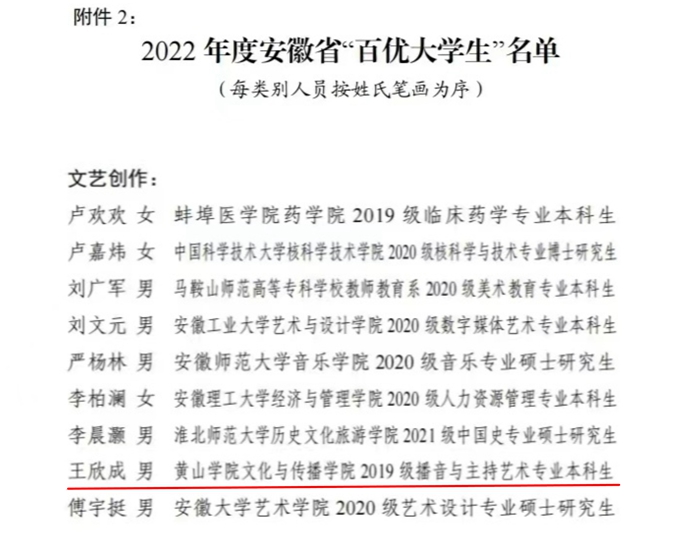近日,由团省委、省委宣传部、省文明办、省教育厅等12家单位联合举办的安徽省“‘十佳’‘百优’大学生”评选结果揭晓。太阳成集团tyc9728学生王欣成荣获2022年度安徽省“百优大学生”(文艺创作类)称号。