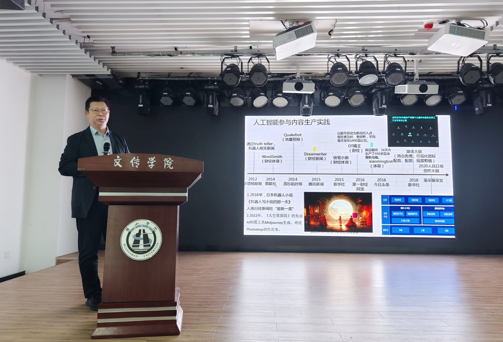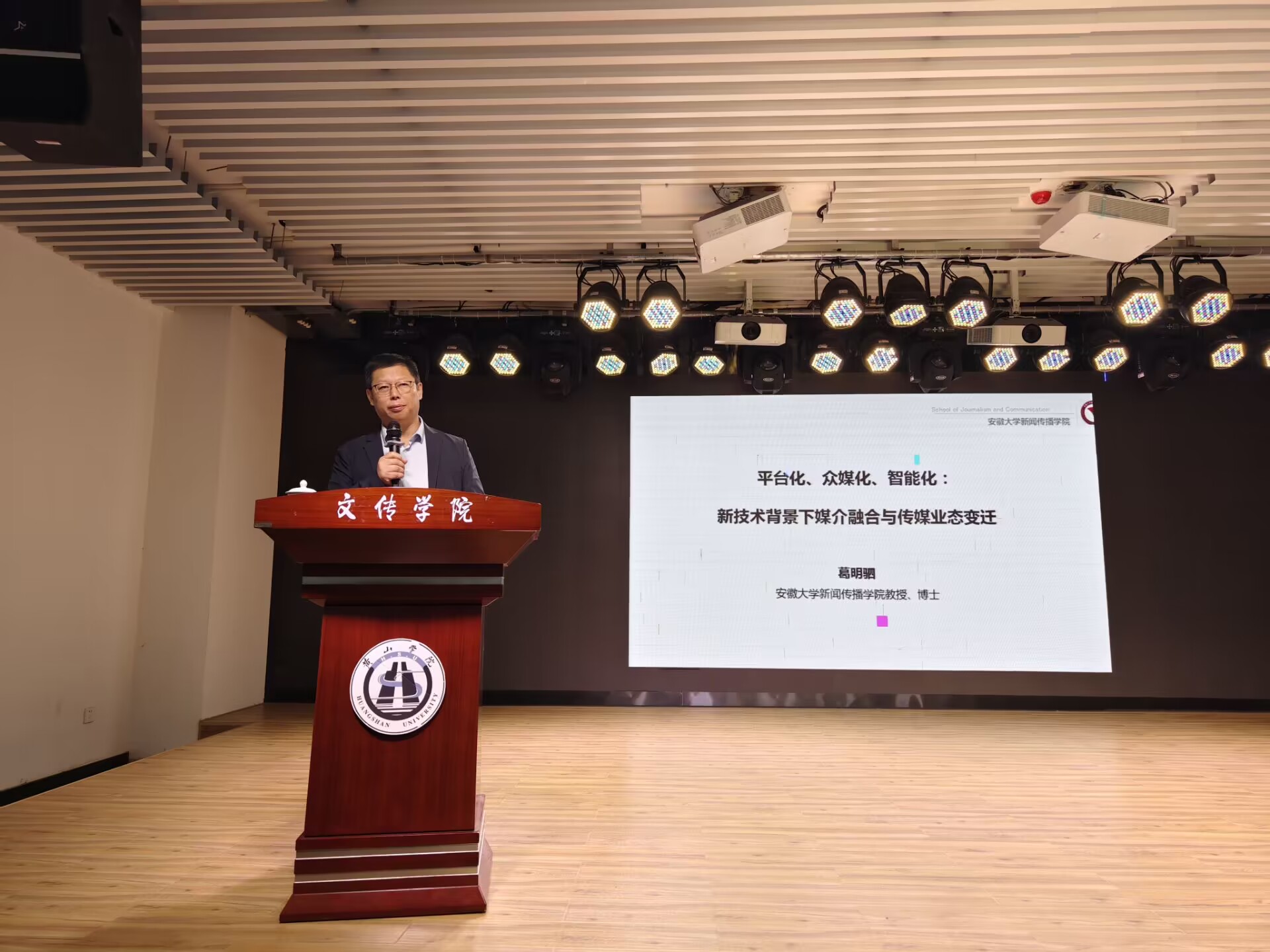 10月24日,安徽大学新闻传播学院葛明驷教授应邀在文澜楼演播厅作题为“平台化、众媒化、智能化:新技术背景下媒介融合与传媒业态变迁”的学术报告。报告会由太阳成集团tyc9728副院长吕正兵主持,近百名师生现场聆听。