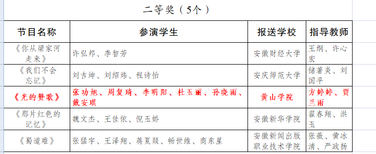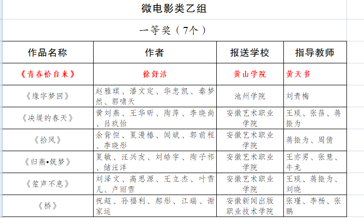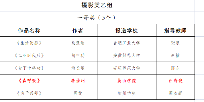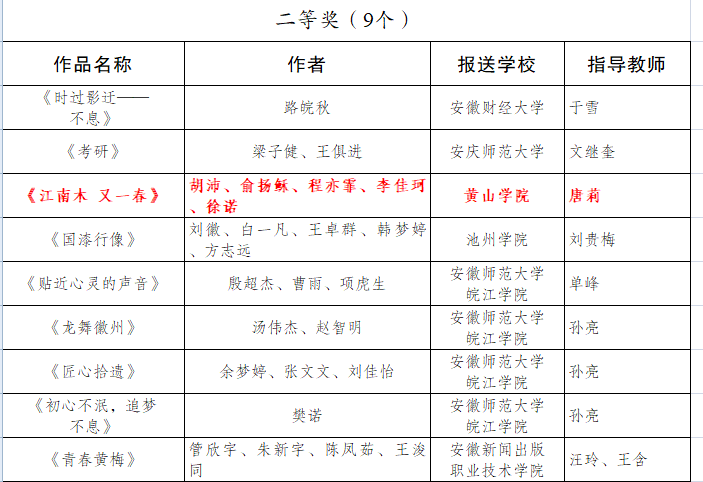 近日,由安徽省教育厅举办的安徽省第七届大学生艺术展演活动评选结果公布,由汪海波老师指导,宋玉清创作的《甲路伞甲天下》、李佳珂创作的《森呼吸》分别获摄影类甲组和乙组一等奖;由黄天书老师指导,徐舒洁创作的《青春恰自来》,唐莉老师指导,胡沛等创作的《江南木 又一春》分别获微电影类乙组一等奖和二等奖;由方婷婷老师、贾兰雨老师指导,张功旭等创作的《光的赞歌》获朗诵集体乙组二等奖。