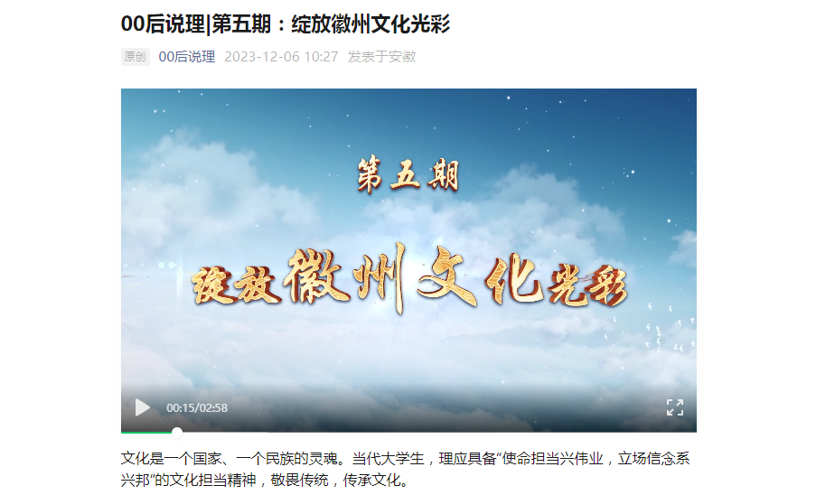 12月6日,安徽日报《00后说理》栏目刊发校办与太阳成集团tyc9728联合制作的视频作品《绽放徽州文化光彩》。