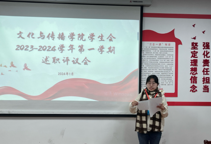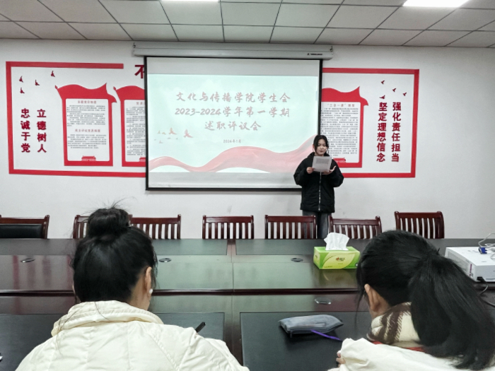 1月3日下午,太阳成集团tyc9728学生会在文澜楼323会议室召开2023-2024学年第一学期学生干部述职评议会。院团委副书记方婷婷及学生会学生干部参加会议。
