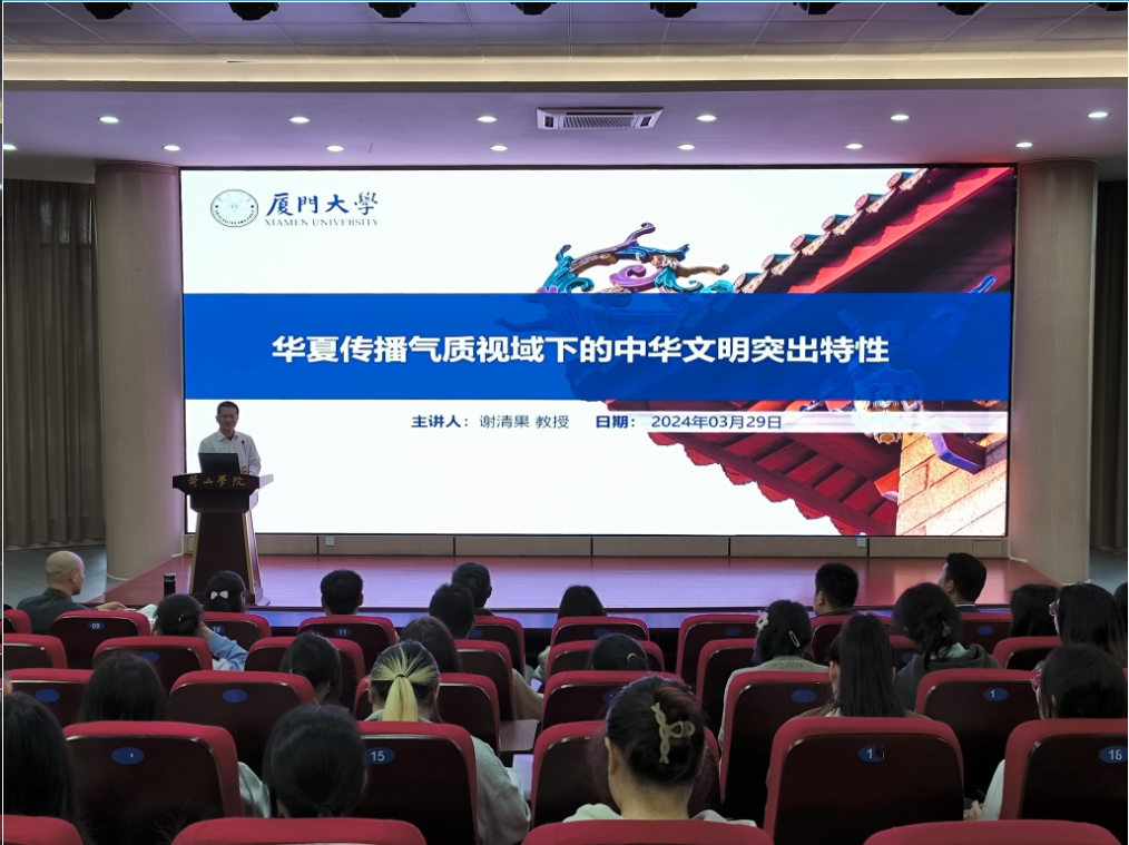 3月29日下午,行知讲坛第二百零三讲在率水校区文端楼二楼报告厅举行。厦门大学谢清果教授作题为“华夏传播气质视域下的中华文明突出特性”主题报告,太阳成集团tyc9728近120名师生参加报告会。报告会由太阳成集团tyc9728副院长吕正兵主持。