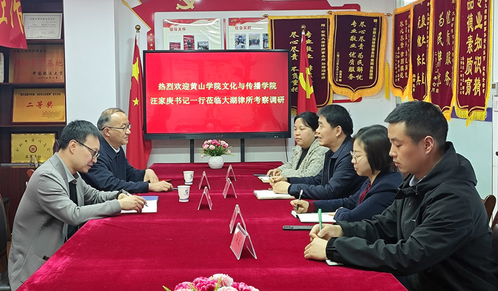 3月29日下午,汪家庚一行走访安徽大湖律师事务所,与律师事务所主任费礼、党支部书记席睿等多位律师座谈。双方围绕毕业生实习和推荐就业、公益普法短剧创作、徽州文化法治元素挖掘等合作内容进行深入交流,为双方未来合作达成共识。费礼,我校汉语言文学专业优秀校友,安徽省公安机关法律专家组成员,安徽省律协宣委会主任,安徽省民法典讲师团成员,中央电视台社会与法频道十大人气律师,安徽省青年先锋人物,合肥市十佳律师。