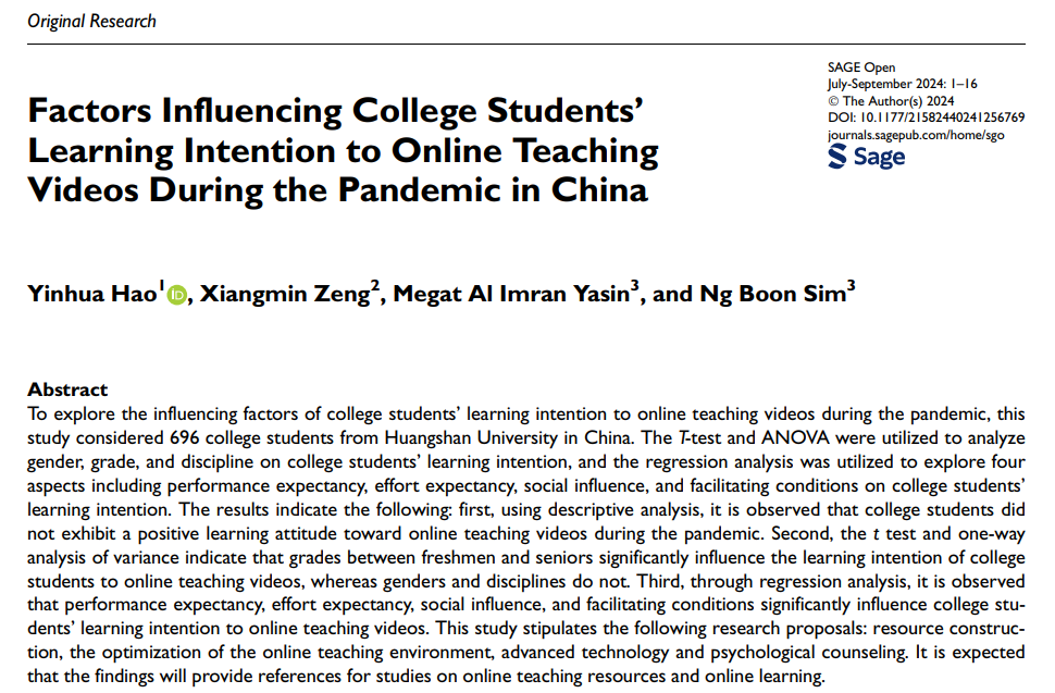 近日,太阳成集团tyc9728青年教师、在读博士郝银华以第一作者身份在SSCI期刊Sage Open发表学术论文Factors Influencing College Students’Learning Intention to Online Teaching Videos During the Pandemic in China。
