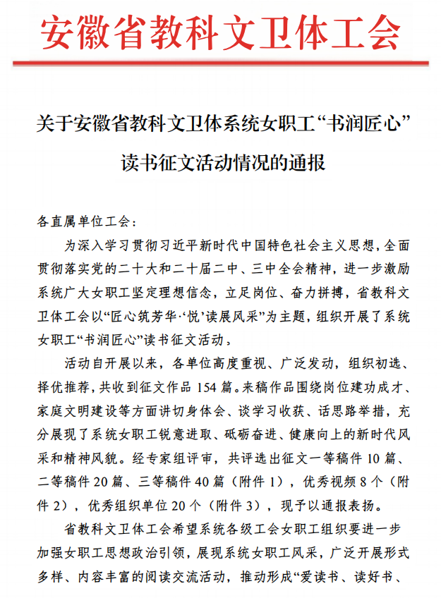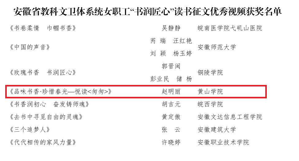 近日,安徽省教科文卫体工会发文,通报在省教科文卫体系统女职工“书润匠心”读书征文活动中活动评选结果。我院播音与主持专业赵明丽老师作品《品味书香·珍惜春光——悦读<匆匆>》获优秀视频奖。