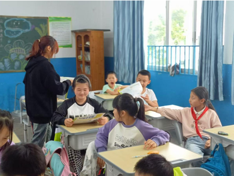 宣讲员给小学生发放往期《行知小学生报》