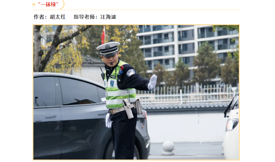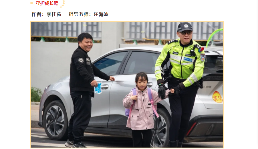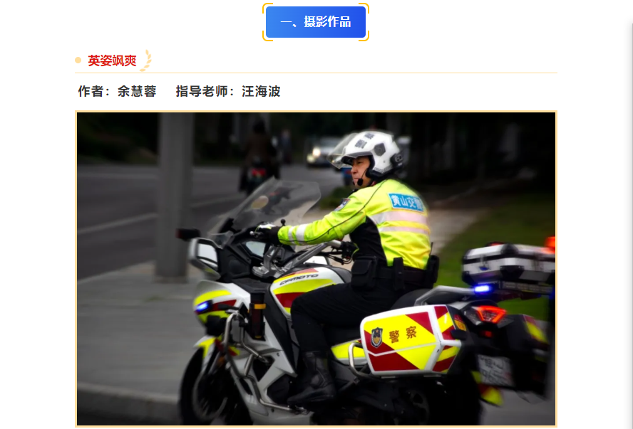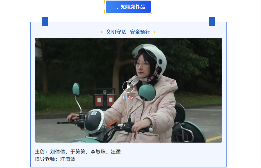 由汪海波老师指导,学生余慧蓉创作的《英姿飒爽》,学生李桂茹创作的《守护成长路》,学生胡太红创作的《“一抹绿”》,学生田文晴创作的《守护》获得摄影作品优秀奖。在短视频作品单元,由汪海波老师指导,学生刘倩倩、于笑笑、李敏珠、汪盈主创的《文明守法 安全骑行》,由刘罗玉老师指导,学生杨凯乐、刘静怡、刘月婷、洪缘芳主创的《宁等三分 不抢一秒》获得优秀奖。由汪海波老师指导,学生郑晓名、李恒健创作的《酒驾旋涡》获平面类优秀作品。