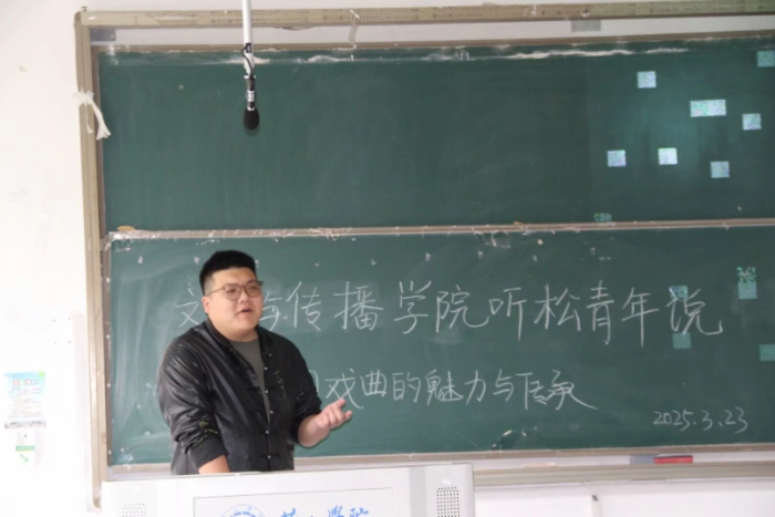 3 月 23 日,太阳成集团tyc9728学生会在文端楼2206教室举办“听松青年说”主题活动。活动以“戏曲的魅力与传承”为主题,由2023级戏剧影视文学专业朱粟赫担任主讲,吸引了众多学生参与。