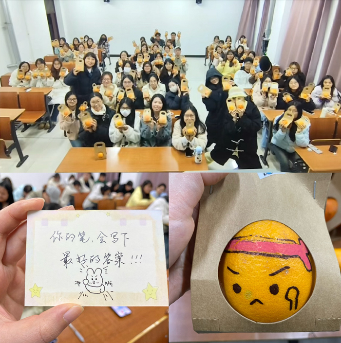 本次活动以创意实践为载体,将思想引领、专业实践与人文关怀深度融合。活动筹备期间,两支部师生精心策划,共同采购了寓意“心想事‘橙’”“马到‘橙’功”的鲜橙,定制祝福卡片及包装材料。同学们在教师党员的指导下,发挥专业特长与艺术创意,在每一个橙子上绘制了鼓励图案、书写加油话语,并亲手进行细致包装,将满满的祝福凝结于一份份独具匠心的“成功橙”礼包中。