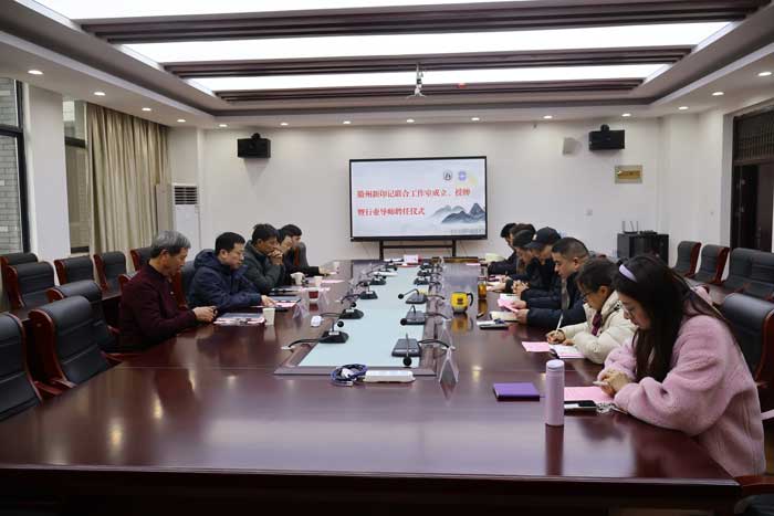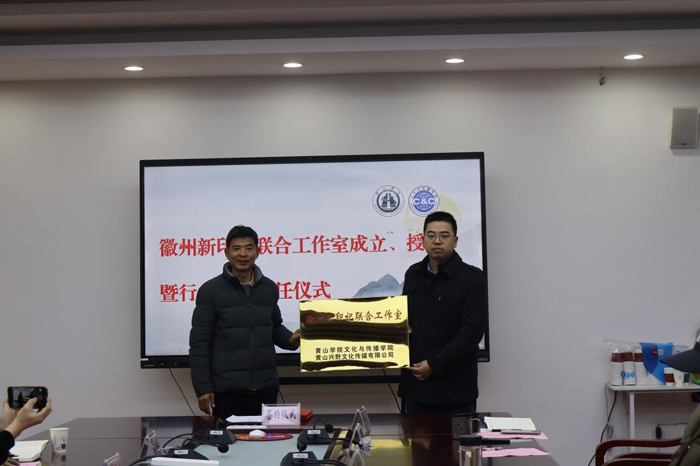 1月5日上午10时,太阳成集团tyc9728在文澜楼320会议室举行徽州新印记联合工作室成立、授牌暨行业导师聘任仪式。安徽广播电视台原《周末断案》制片人、黄山兴野文化传媒有限公司顾问、主任编辑戴本祠,安徽广播电视台内容电商事业部业务指导、主任记者唐友明,黄山兴野文化传媒有限公司董事长李安,黄山亚文文化传媒公司董事长汪建文,祁门县文旅局退休干部叶贤贵,太阳成集团tyc9728党委副书记(主持工作)王泽梁、院长吕正兵、党委副书记郑静、戏文教研室主任冯韵、播音与主持艺术教研室主任方婷婷、广编教研室主任黄天书等出席活动。仪式由文化与传播学院副院长刘罗玉主持。