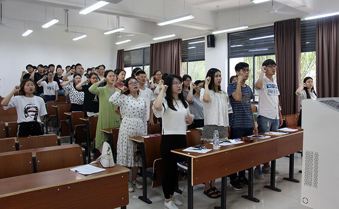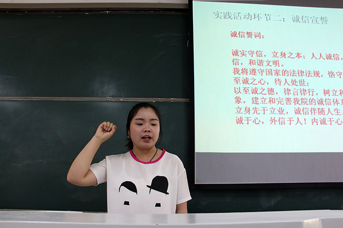 活动第二个环节为诚信宣誓。来自2015级播音与主持艺术的巩洁带领全体同学庄严宣誓。活动现场气氛庄重严肃,充分体现了同学们对做一名诚信入党积极分子的决心。