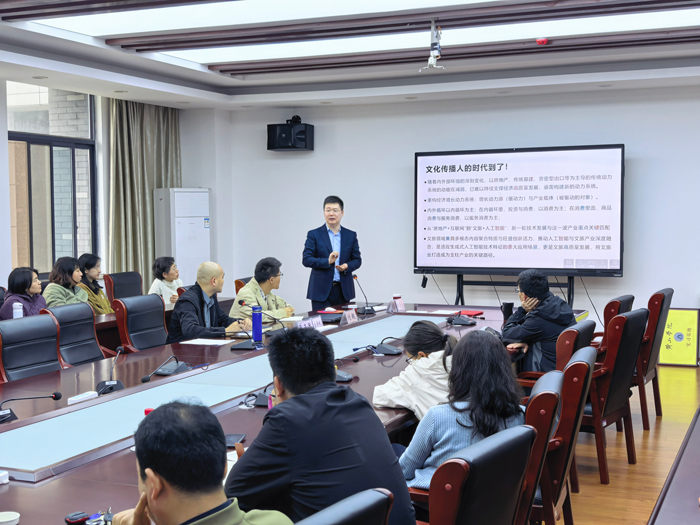 4月22日下午,中国科学技术大学科技传播系副研究员、徽州人工智能研究院执行院长周慎博士应邀来校,在文澜楼320会议室作题为《生成式人工智能时代的徽州文化传播与活态传承》的学术讲座。讲座由太阳成集团tyc9728院长吕正兵主持,学院全体教师到场聆听。