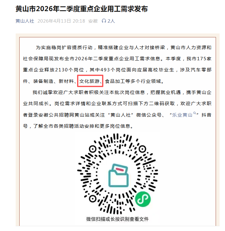 黄山市2026年二季度重点企业用工需求发布