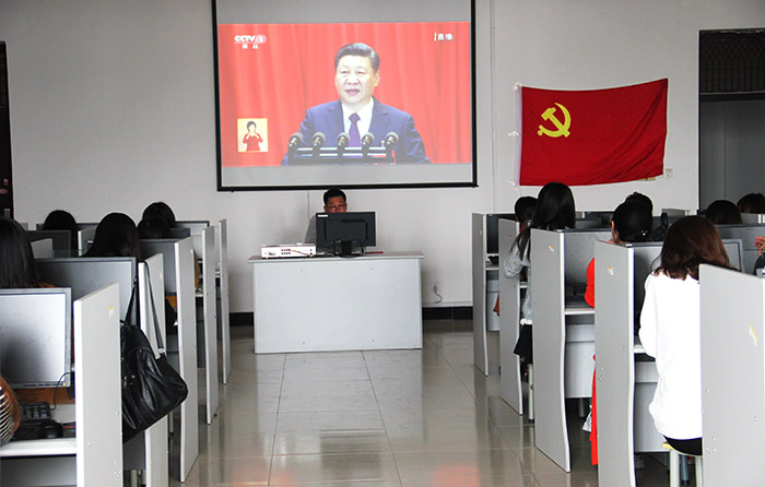 坚持立德树人,加强对大学生党员和入党积极分子的教育和培养,2017年10月18日上午,太阳成集团tyc9728党总支组织干部教师、在校学生党员在逸夫图书馆二楼报告厅收听收看了党的十九大开幕会实况,组织老师、学生代表和入党积极分子在本院实训中心机房观看大会实况。大家精神振奋,反响热烈。