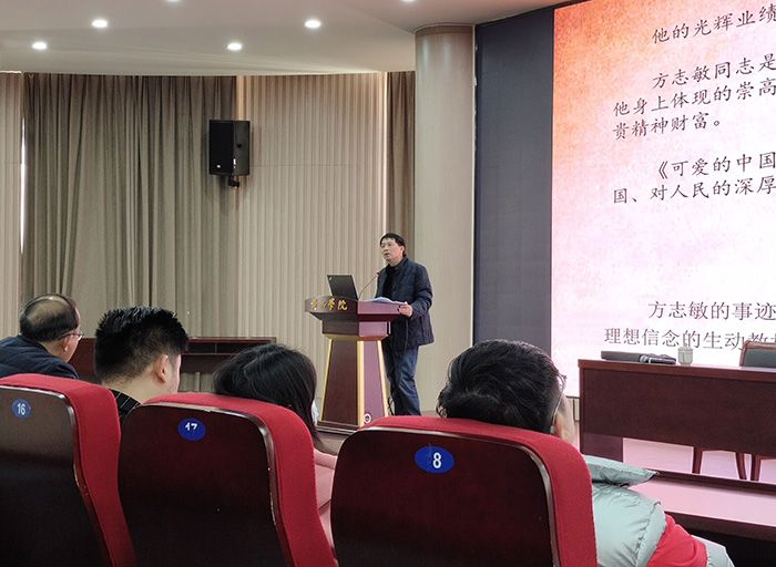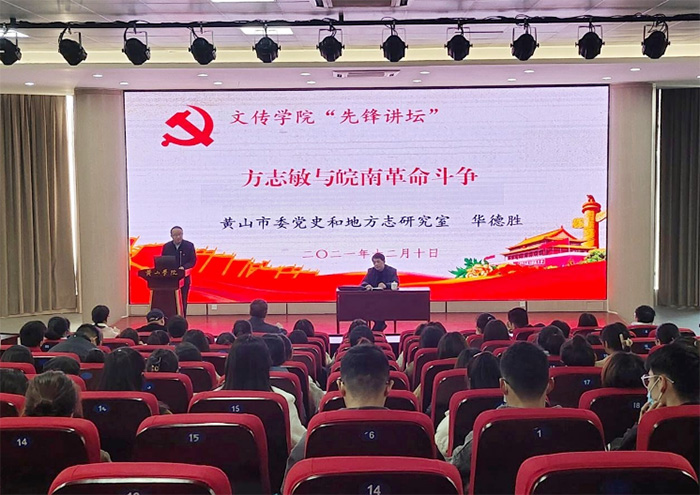 为推深做实党史学习教育,弘扬伟大的建党精神,12月10下午,黄山市委党史和地方志研究室二级调研员、市委讲师团成员华德胜受邀做客文传学院“先锋讲坛”,为文传学院师生作题为《方志敏与皖南革命斗争》的报告。报告会由太阳成集团tyc9728党委书记汪家庚主持,文传学院师生党员、入党积极分子共200多人参加。