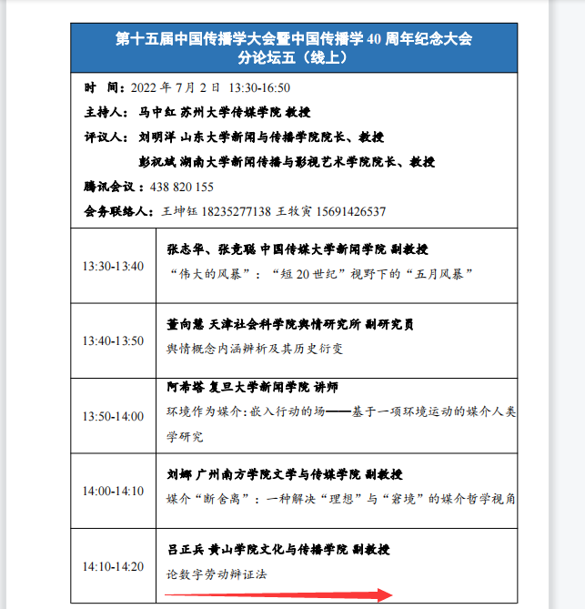 7月2日至3日,第十五届中国传播学大会暨中国传播学四十周年纪念大会以线上线下结合的方式在苏州大学召开。我院新闻学副教授吕正兵提交的论文《论数字劳动辩证法》经组委会专家的匿名评审,入选大会的第五分论坛并做线上发言。