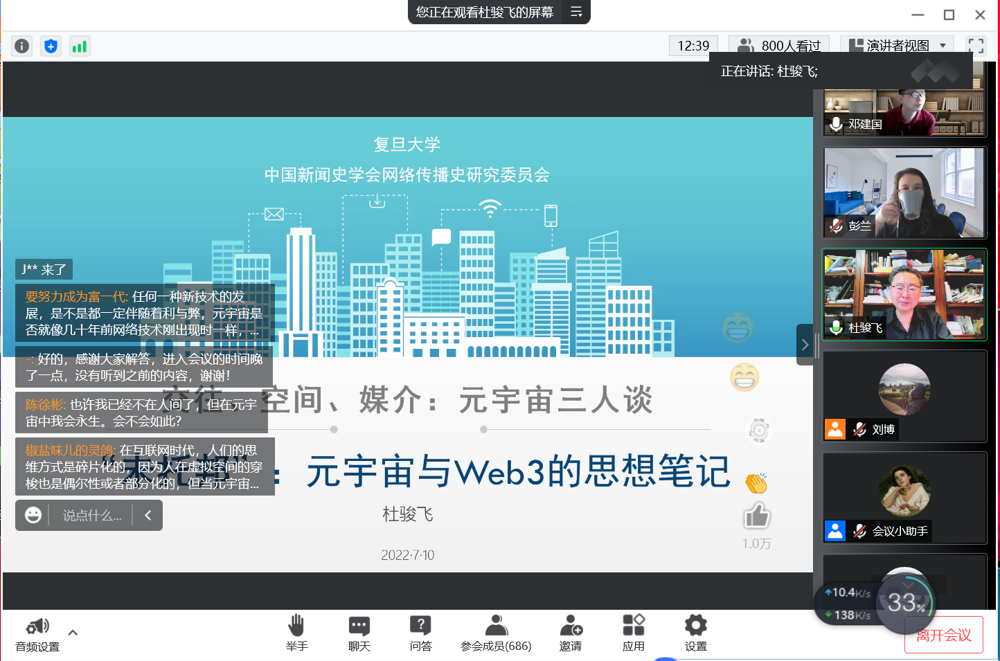 报告中,彭兰、杜骏飞、邓建国分别针对元宇宙中的空间与身体、元宇宙率、元元媒介、数字孪生、未托邦、流动的部落化、自反性沉迷、未定义治理等前沿学术问题进行了学理性阐释和探讨。