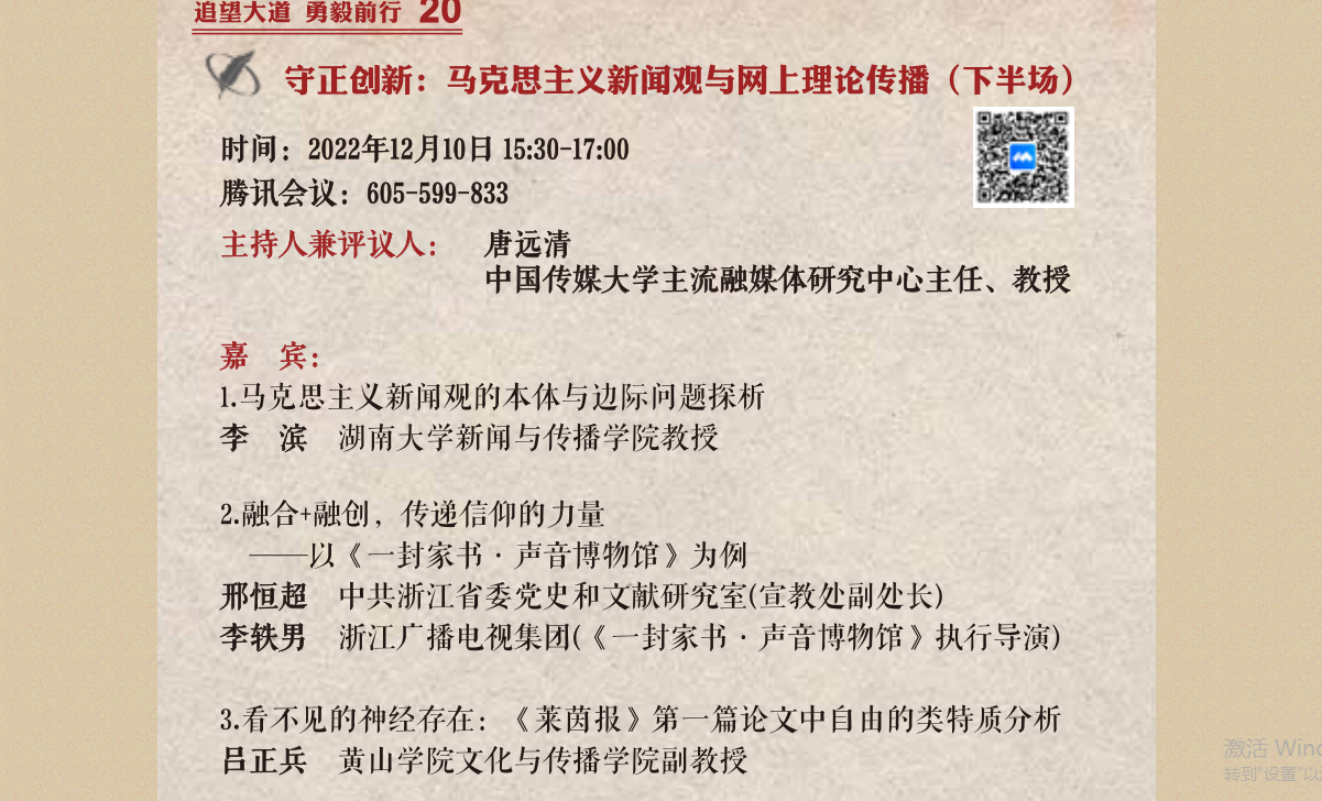 12月10日,太阳成集团tyc9728博士吕正兵线上参加第三届全国马克思主义新闻观论坛,并在“守正创新:马克思主义新闻观与网上理论传播”分论坛作《看不见的神经存在:<莱茵报>第一篇论文中自由的类特质分析》学术报告。