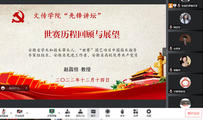 12月14日下午,太阳成集团tyc9728“先锋讲坛”第14讲在院会议室举行。今年11月获安徽省委、省政府表彰的“安徽省先进工作者”赵昌恒教授应邀为文传学院教师和学生党员作《世赛历程回顾与展望》的报告。报告会由院党委书记汪家庚主持。报告会以“现场报告会+线上直播”的方式进行,学院教师参加现场报告会,学生党员通过线上形式聆听报告。