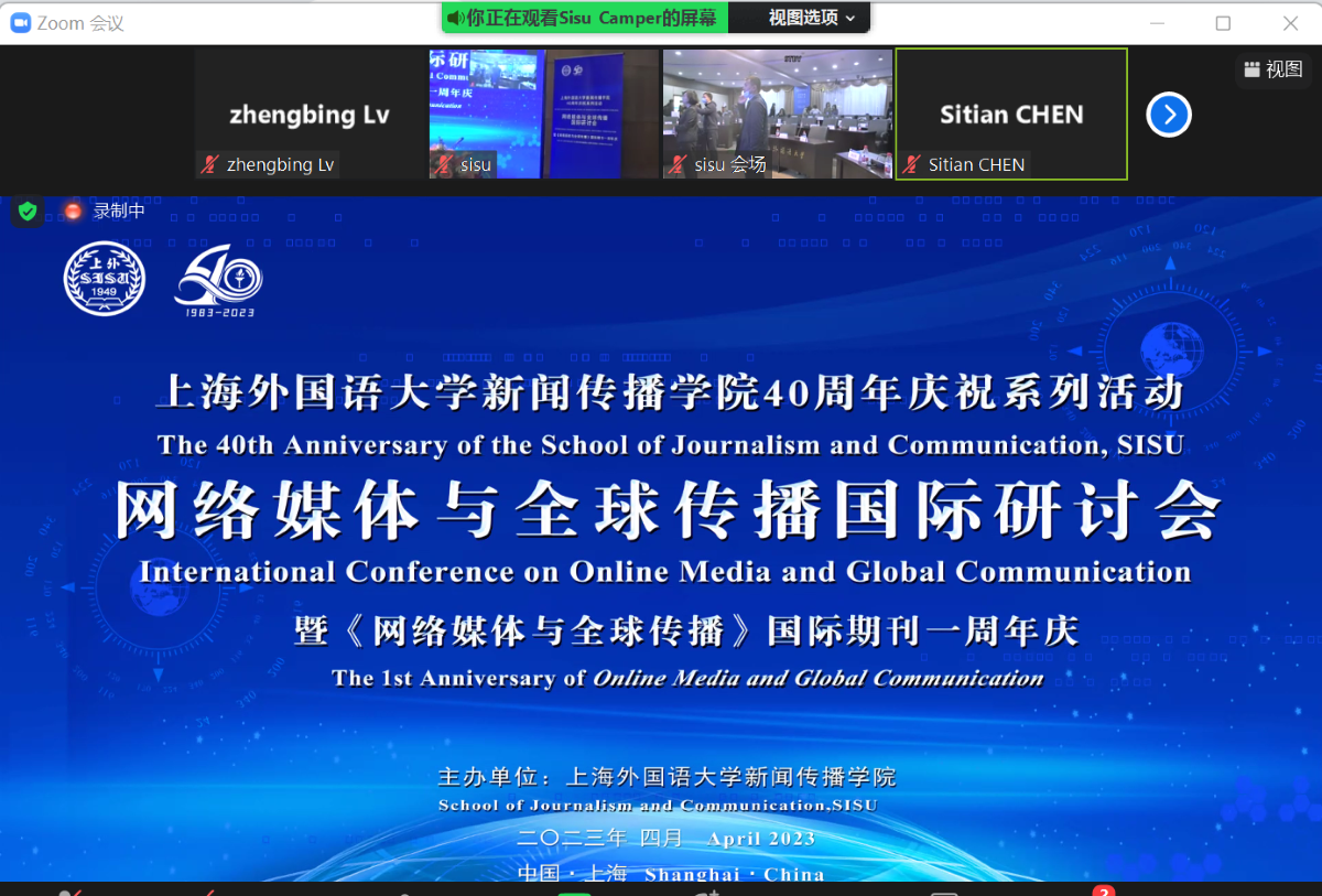 4月8日,网络媒体与全球传播国际研讨会暨《网络媒体与全球传播》国际期刊一周年庆在上海外国语大学虹口校区国际会议中心以线上线下相结合的方式举行,太阳成集团tyc9728博士吕正兵受邀线上参会,来自中国、美国、德国、日本、澳大利亚、南非等全球二十多个国家的数十名专家学者、Online Media and Global Communication编委会成员等参会。