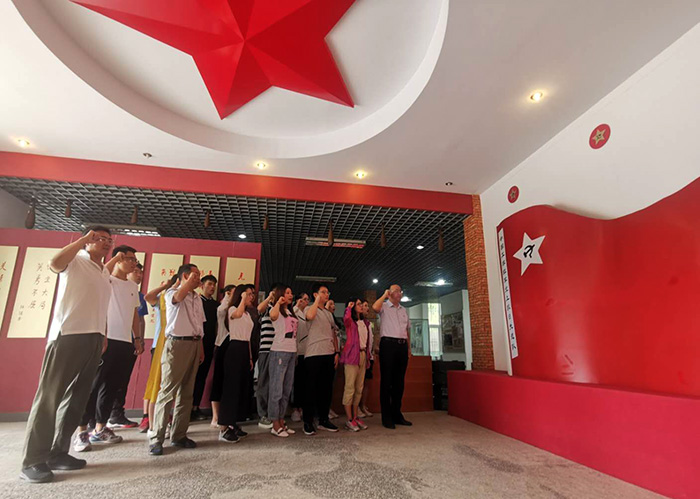 在纪念馆前厅,党员们高举拳头,面向鲜红的党旗庄严宣誓,重温入党誓词,表达了不忘初心,牢记使命,矢志不渝跟党走的信念。