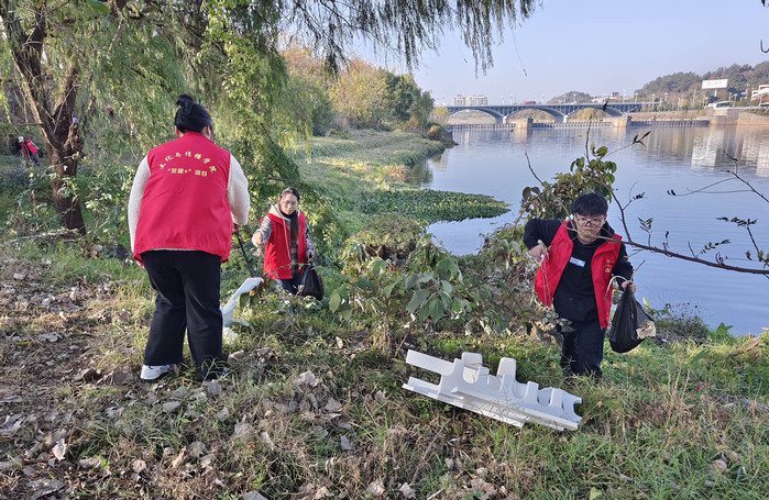 活动现场,志愿者们分工明确,相互配合,手持垃圾钳、垃圾袋,从草堆中、角落里翻捡出零食袋、矿泉水瓶、白色泡沫板等垃圾杂物,细心装入垃圾袋中。经过1个多小时的劳动,新安江岸边卫生责任区环境焕然一新。