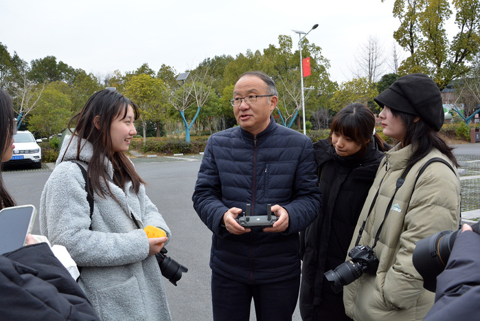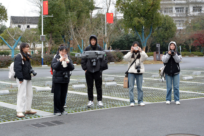 下午同学们来到徽州区西溪南古村落,在村口广场,老师演示讲解无人机拍摄技术,并为全班同学拍摄了“全家福”。在西溪南村中,劳作的村民,三两的老人,枯萎藤蔓都是大家拍摄的焦点。傍晚时分,同学们到达最后一个拍摄地点莘墟村,青瓦白墙的街巷墙壁上都是绘画和书法,彰显着新时代美丽乡村的文化气息。