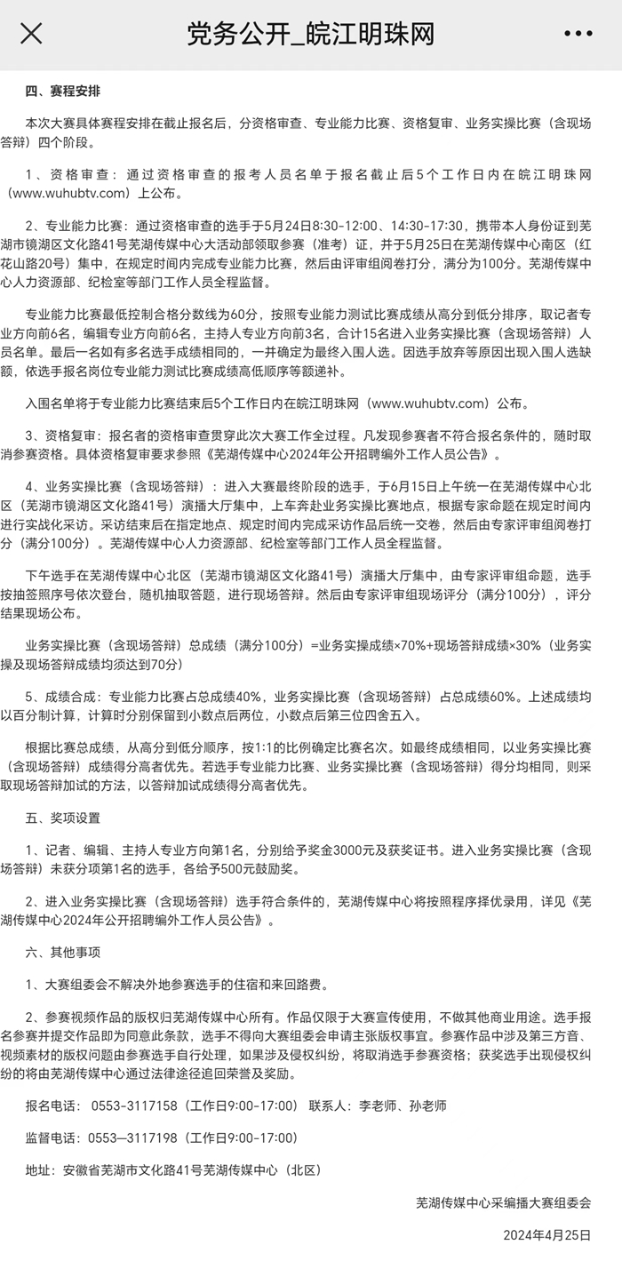 本次大赛面向全国诚邀优秀青年参加,芜湖传媒中心根据比赛实际成绩与优胜选手签订劳动合同,试用期满将有机会进入芜湖传媒中心记者编辑主持人队伍(详见2024年4月25日皖江明珠网http://www.wuhubtv.com/《芜湖传媒中心2024年公开招聘编外工作人员公告》)。欢迎符合条件的青年踊跃报名参赛。